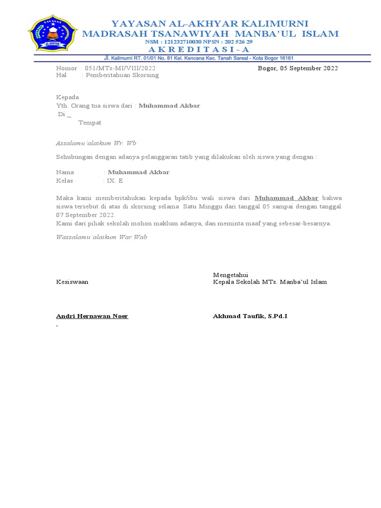 Maka kami memberitahukan kepada bpk/ibu wali siswa dari Muhammad Akbar bahwa
