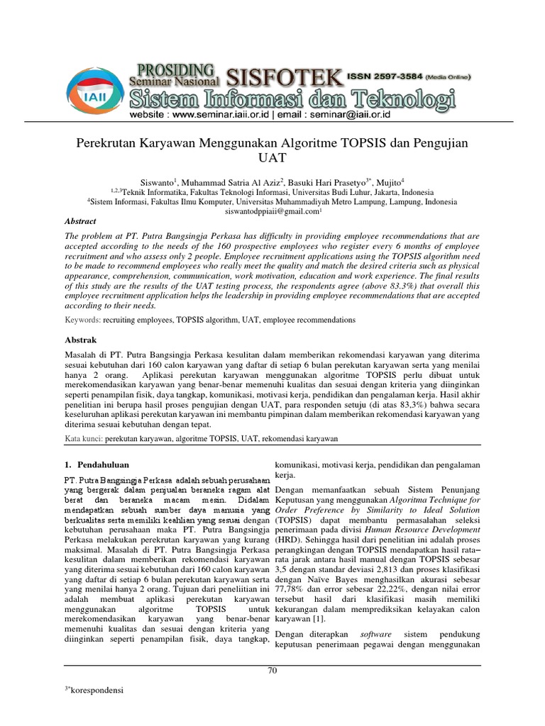 Kata kunci: perekutan karyawan, algoritme TOPSIS, UAT, rekomendasi karyawan