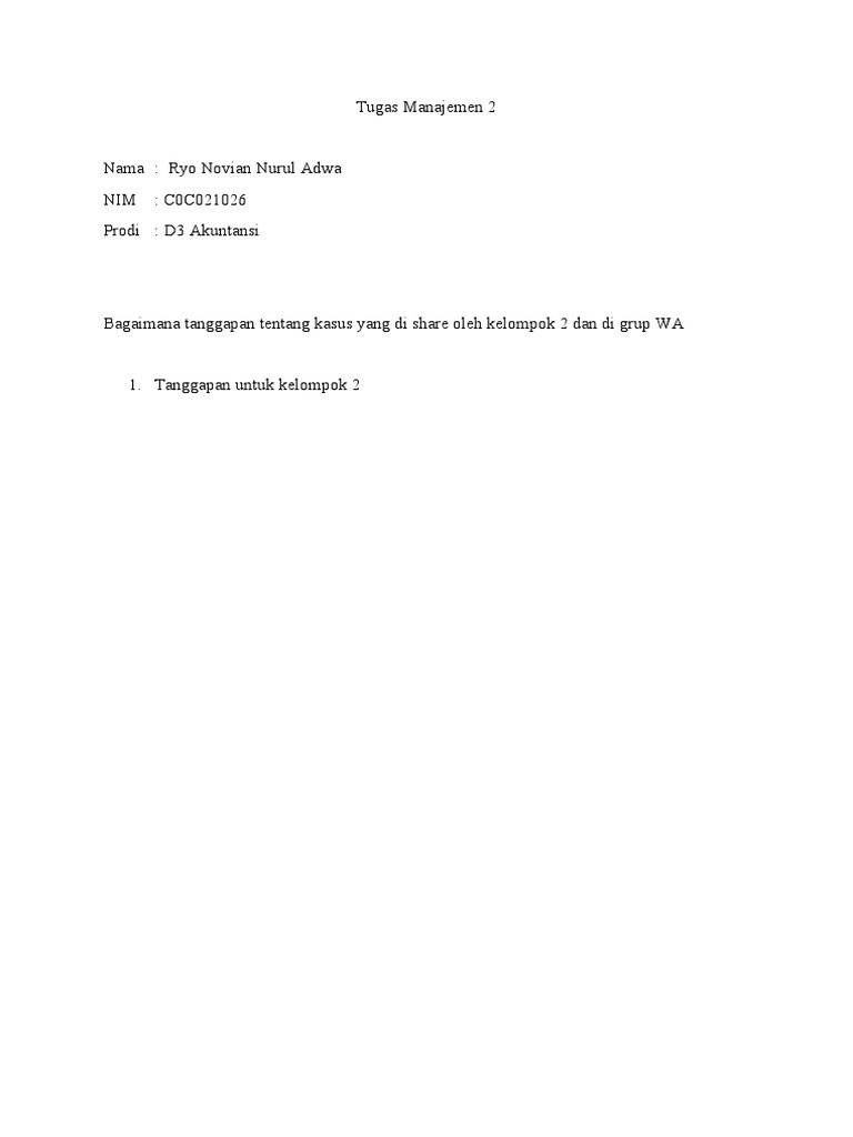 Dokumen ini berisi informasi tentang tugas manajemen 2 dari seorang mahasiswa prodi D3 Akuntansi bernama Ryo Novian Nurul Adwa dengan NIM C0C021026. Mahasiswa ini diminta memberikan tanggapan tentang kasus yang dibagikan kelompok 2 di grup WA.
