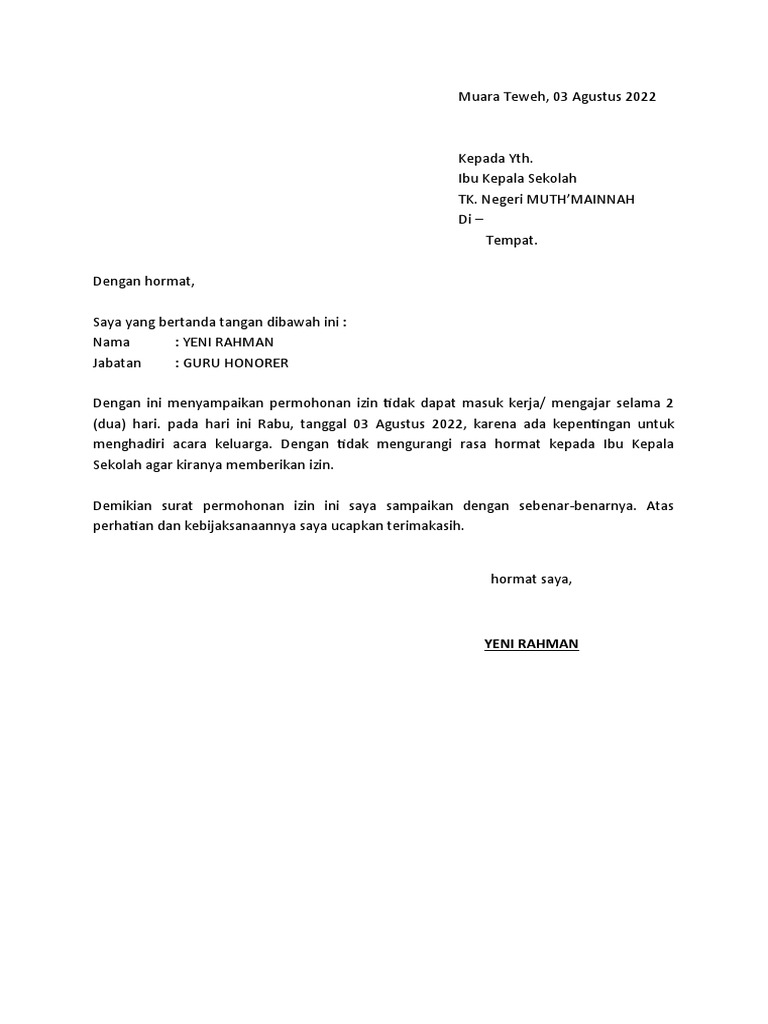 Dengan ini menyampaikan permohonan izin tidak dapat masuk kerja/ mengajar selama 2