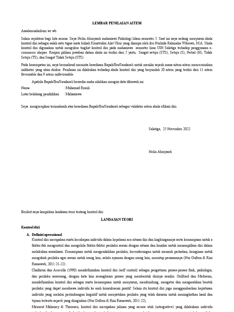 Pada kesempatan ini, saya bermaksud meminta kesediaan Bapak/Ibu/Saudara/i untuk menilai sejauh mana aitem-aitem mencerminkan
