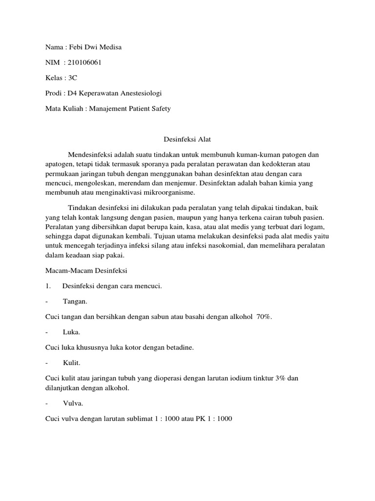 yang digunakan saat pelaksanaan asuhan keperawatan. Tujuan desinfeksi dengan bahan kimia