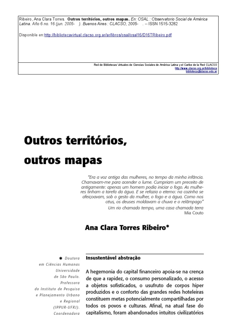 Fuentes, Carlos 1994 Valiente mundo nuevo: pica, utopa y mito en la novela hispanoamericana (Mxico: Fondo de Cultura Econmica) 2 impresso. Guattari, Flix 1985 Espao e poder: a criao de territrios na cidade em Espao & Debates (So Paulo) Ano V, N 16. Kosik, Karel 1976 Dialtica do concreto (Rio de Janeiro: Paz e Terra) 4 edio. Oliveira, Francisco de 1976 A economia brasileira: crtica razo dualista (So Paulo: Editora Brasiliense/Edies CEBRAP) 2 edio. Pena-Veiga, Alfredo e Nascimento, Elimar Pinheiro do (orgs.) 1999 O pensar complexo: Edgar Morin e a crise da modernidade (Rio de Janeiro: Garamond). Porto-Gonalves, Carlos Walter 2002 Da geografia s geo-grafias: um mundo em busca de novas territorialidades em Cecea, Ana Esther e Sader, Emir (coords.) La guerra infinita: hegemona y terror mundial (Buenos Aires: CLACSO). Raffestin, Claude 1993 Por uma geografia do poder (So Paulo: tica). Ribeiro, Ana Clara Torres e Silva, Ctia Antonia 2004 Impulsos globais e espao urbano: sobre o novo economicismo em Ribeiro, Ana Clara Torres (comp.) El rostro urbano de Amrica Latina (Buenos Aires: CLACSO). Santos, Milton 1994 Tcnica, espao, tempo: globalizao e meio tcnico-cientfico informacional (So Paulo: HUCITEC). Santos, Milton 1996 A natureza do espao: tcnica e tempo, razo e emoo (So Paulo: HUCITEC). Santos, Milton 1999 O territrio e o saber local: algumas categorias de anlise em Cadernos IPPUR, Vol. XIII, N 2. Santos, Milton 2000 Por uma outra globalizao: do pensamento nico conscincia universal (Rio de Janeiro/So Paulo: Record). Sousa Santos, Boaventura de 1988 Um discurso sobre as cincias (Porto: Edies Afrontamento) 10 edio. Sousa Santos, Boaventura de (org.) 2002 Democratizar a democracia: os caminhos da democracia participativa (Rio de Janeiro: Civilizao Brasileira). Villoria, Alicia Lindn 1999 De la trama de la cotidianidad a los modos de vida urbanos. El Valle de Chalco (Mxico: Centro de Estudios Sociolgicos de El Colegio de Mxico/El Colegio Mexiquense).