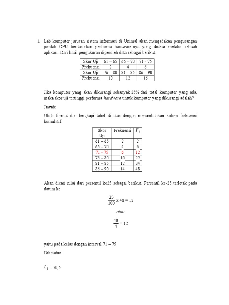 Akan dicari nilai dari persentil ke25 sebagai berikut. Persentil ke-25 terletak pada
