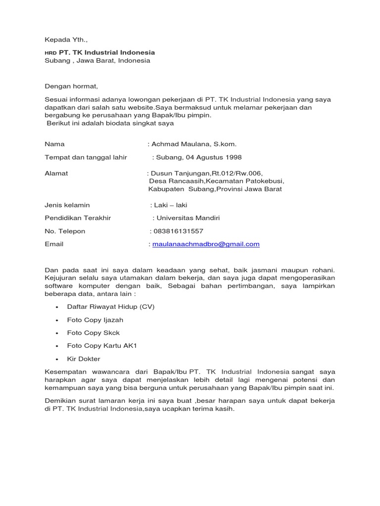 Sesuai informasi adanya lowongan pekerjaan di PT. TK Industrial Indonesia yang saya