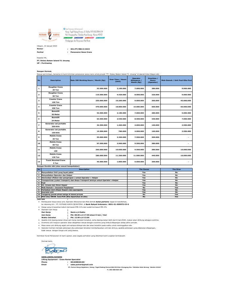 Sesuai permintaan, bersama ini kami kirimkan penawaran sewa crane untuk proyek "PT. Rotary Batam Island TJ. Uncang" di daerah Kota Cilegon sbb :