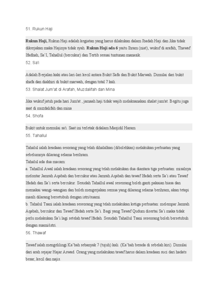 dikerjakan maka Hajinya tidak syah. Rukun Haji ada 6 yaitu Ihram (niat), wukuf di arafah, Thawaf