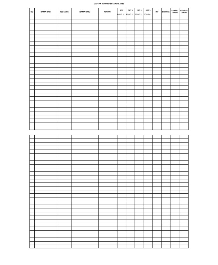 Daftar imunisasi tahun 2021 untuk beberapa bayi dengan nama, tanggal lahir, nama orang tua, alamat, dan jadwal imunisasi yang meliputi BCG, DPT, Polio, Combo Campak serta tanggal pelaksanaannya.