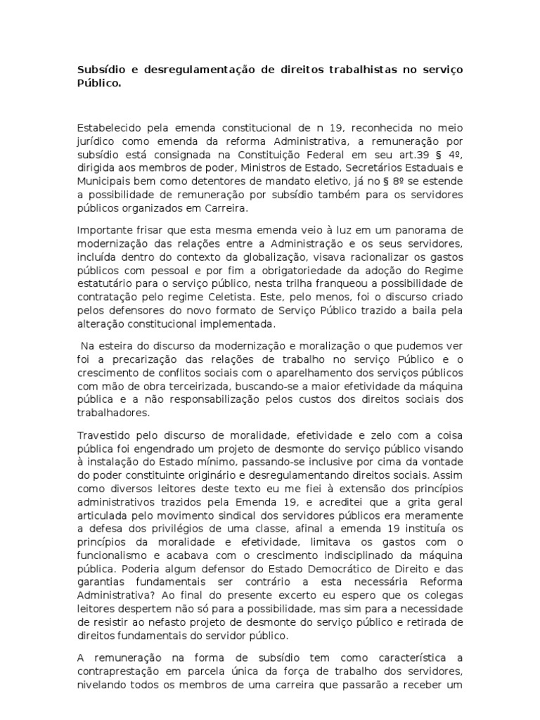 Estabelecido pela emenda constitucional de n 19, reconhecida no meio jurdico como emenda da reforma Administrativa, a remunerao por subsdio est consignada na Constituio Federal em seu art.39 4, dirigida aos membros de poder, Ministros de Estado, Secretrios Estaduais e Municipais bem como detentores de mandato eletivo, j no 8 se estende a possibilidade de remunerao por subsdio tambm para os servidores pblicos organizados em Carreira. Importante frisar que esta mesma emenda veio luz em um panorama de modernizao das relaes entre a Administrao e os seus servidores, includa dentro do contexto da globalizao, visava racionalizar os gastos pblicos com pessoal e por fim a obrigatoriedade da adoo do Regime estatutrio para o servio pblico, nesta trilha franqueou a possibilidade de contratao pelo regime Celetista. Este, pelo menos, foi o discurso criado pelos defensores do novo formato de Servio Pblico trazido a baila pela alterao constitucional implementada. Na esteira do discurso da modernizao e moralizao o que pudemos ver foi a precarizao das relaes de trabalho no servio Pblico e o crescimento de conflitos sociais com o aparelhamento dos servios pblicos com mo de obra terceirizada, buscando-se a maior efetividade da mquina pblica e a no responsabilizao pelos custos dos direitos sociais dos trabalhadores. Travestido pelo discurso de moralidade, efetividade e zelo com a coisa pblica foi engendrado um projeto de desmonte do servio pblico visando instalao do Estado mnimo, passando-se inclusive por cima da vontade do poder constituinte originrio e desregulamentando direitos sociais. Assim como diversos leitores deste texto eu me fiei extenso dos princpios administrativos trazidos pela Emenda 19, e acreditei que a grita geral articulada pelo movimento sindical dos servidores pblicos era meramente a defesa dos privilgios de uma classe, afinal a emenda 19 institua os princpios da moralidade e efetividade, limitava os gastos com o funcionalismo e acabava com o crescimento indisciplinado da mquina pblica. Poderia algum defensor do Estado Democrtico de Direito e das garantias fundamentais ser contrrio a esta necessria Reforma Administrativa? Ao final do presente excerto eu espero que os colegas leitores despertem no s para a possibilidade, mas sim para a necessidade de resistir ao nefasto projeto de desmonte do servio pblico e retirada de direitos fundamentais do servidor pblico. A remunerao na forma de subsdio tem como caracterstica a contraprestao em parcela nica da fora de trabalho dos servidores, nivelando todos os membros de uma carreira que passaro a receber um