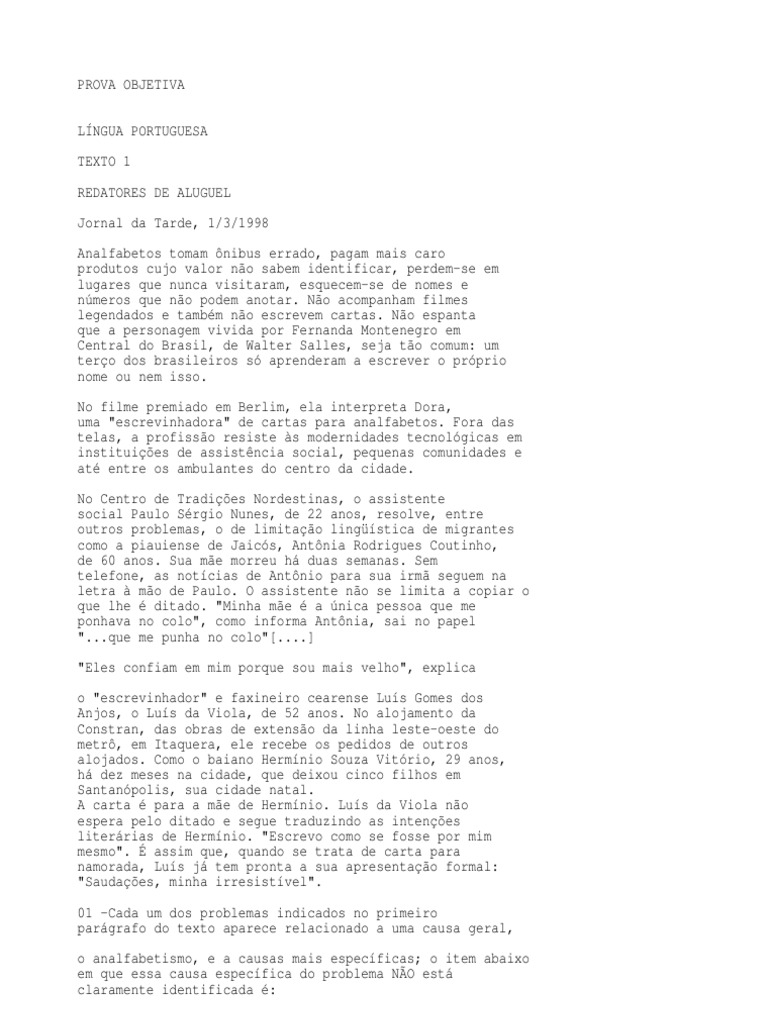 (A) tomam nibus errado -no sabem ler o nmero ou o roteiro do nibus; (B) pagam mais caro produtos -no podem comparar preos; (C) perdem-se em lugares -no sabem ler placas de orientao; (D) esquecem-se de nomes -no podem tomar notas; (E) no acompanham filmes legendados -no possuem velocidade de leitura. 02 -Aps a primeira frase -analfabetos tomam nibus errado -o sujeito (os analfabetos) no mais mencionado, configurando o que se chama uma elipse. Assim, h elipse do sujeito nas formas verbais pagam, sabem, perdem-se, esquecem-se, podem, acompanham e escrevem. Nesse caso, a elipse pde ser realizada porque: (A) o contexto identifica o termo omitido; (B) o texto necessita encurtar sua extenso; (C) as formas verbais esto na terceira pessoa do plural; (D) o sujeito pronominal sempre omitido; (E) os verbos aparecem prximos ao sujeito analfabetos. 03 -Segundo o texto, a figura do redator de aluguel s possvel porque: (A) h muitas pessoas desempregadas; (B) nem todas as pessoas tm tempo de escrever cartas; (C) o Brasil tem um tero de sua populao analfabeta; (D) as pequenas comunidades confiam em seus vizinhos; (E) muitos no sabem expressar verdadeiramente o que querem dizer. 04 -A profisso de "escrevinhador" aparece designada entre aspas porque: (A) representa uma atividade de baixo nvel cultural; (B) se trata de uma profisso recente, ainda no reconhecida; (C) o vocbulo muito antigo na lngua portuguesa; REALIZAO