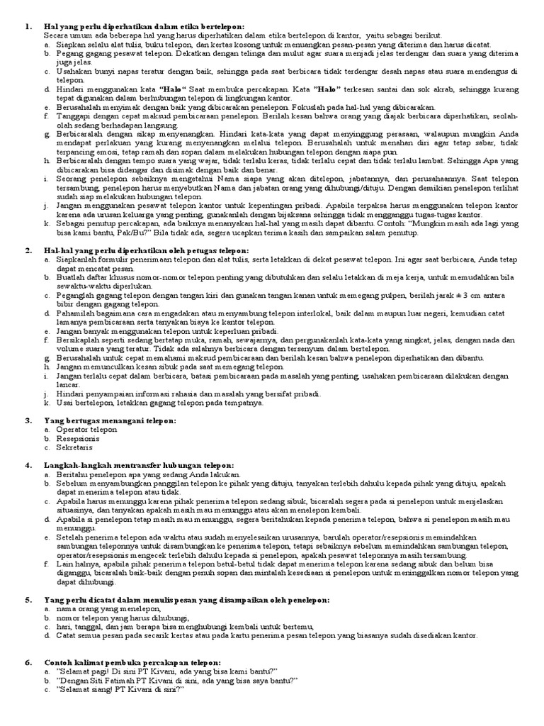 Secara umum ada beberapa hal yang harus diperhatikan dalam etika bertelepon di kantor, yaitu sebagai berikut.