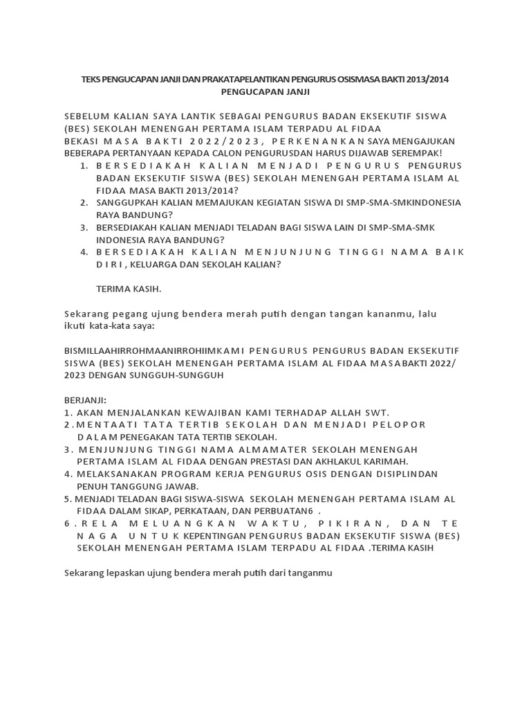 TEKS PENGUCAPAN JANJI DAN PRAKATAPELANTIKAN PENGURUS OSISMASA BAKTI 2013/2014