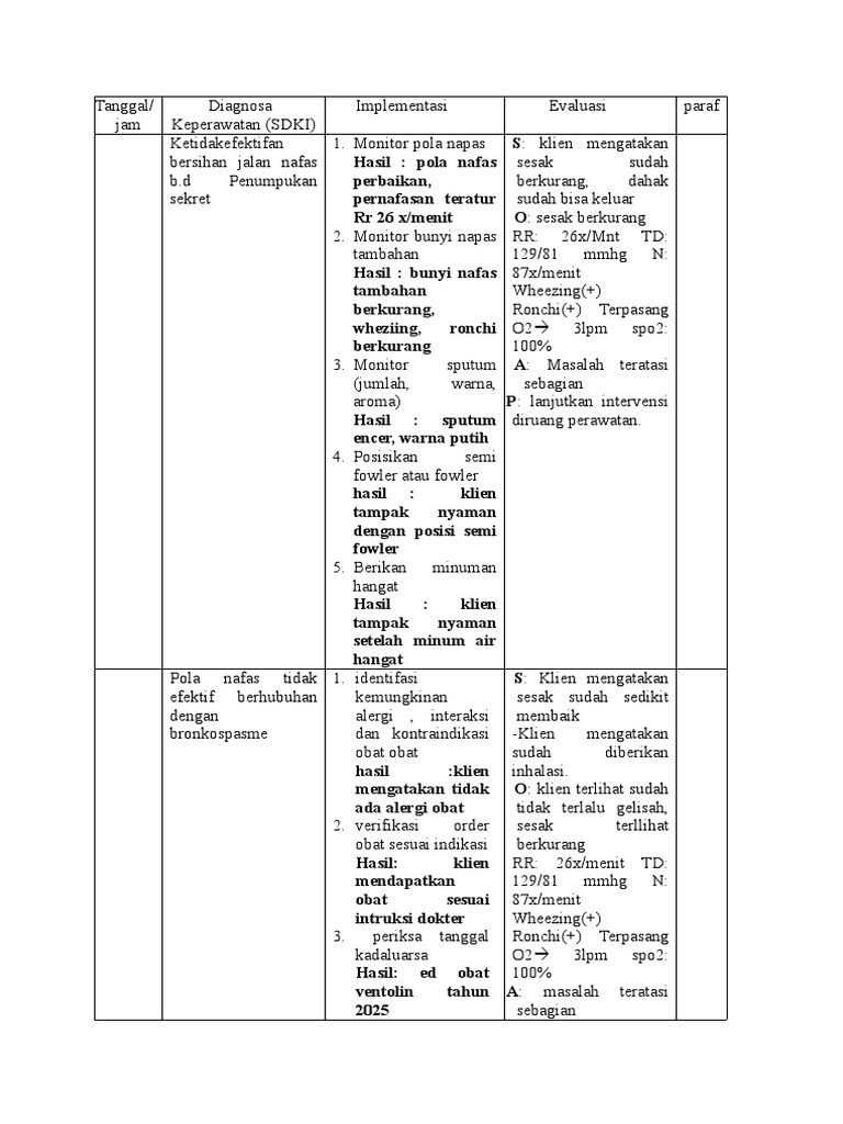 bersihan jalan nafas Hasil : pola nafas sesak sudah