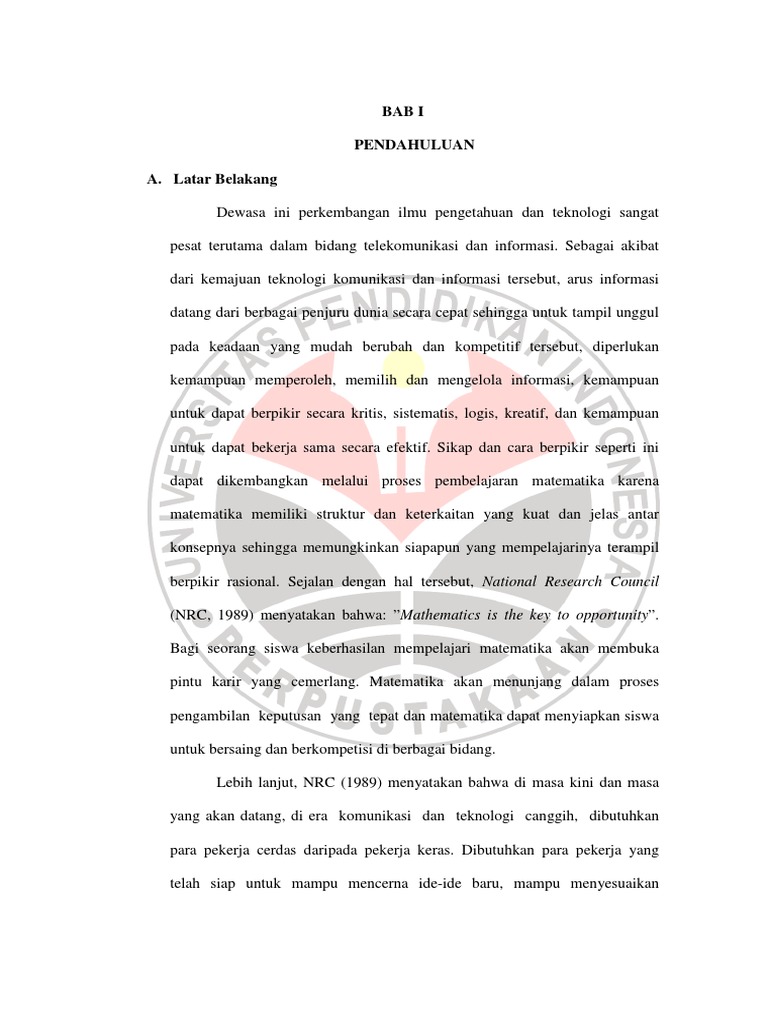 (NRC, 1989) menyatakan bahwa: ”Mathematics is the key to opportunity”.