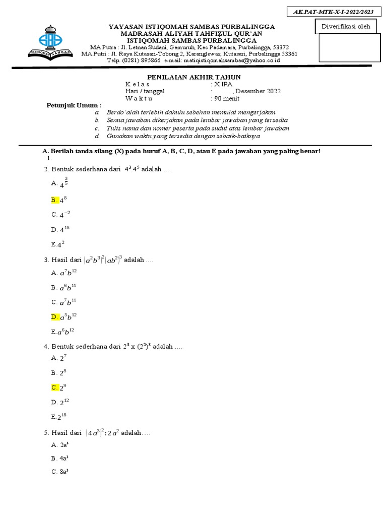 A. Berilah tanda silang (X) pada huruf A, B, C, D, atau E pada jawaban yang paling benar!