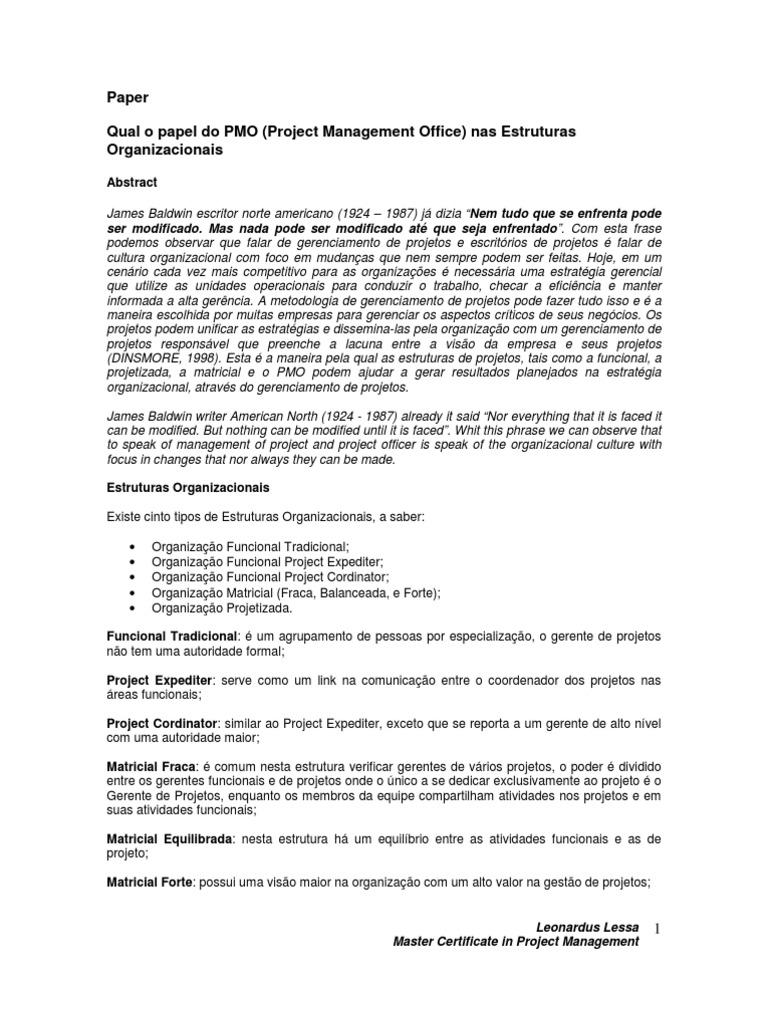 Abstract James Baldwin escritor norte americano (1924 1987) j dizia Nem tudo que se enfrenta pode ser modificado. Mas nada pode ser modificado at que seja enfrentado. Com esta frase podemos observar que falar de gerenciamento de projetos e escritrios de projetos falar de cultura organizacional com foco em mudanas que nem sempre podem ser feitas. Hoje, em um cenrio cada vez mais competitivo para as organizaes necessria uma estratgia gerencial que utilize as unidades operacionais para conduzir o trabalho, checar a eficincia e manter informada a alta gerncia. A metodologia de gerenciamento de projetos pode fazer tudo isso e a maneira escolhida por muitas empresas para gerenciar os aspectos crticos de seus negcios. Os projetos podem unificar as estratgias e dissemina-las pela organizao com um gerenciamento de projetos responsvel que preenche a lacuna entre a viso da empresa e seus projetos (DINSMORE, 1998). Esta a maneira pela qual as estruturas de projetos, tais como a funcional, a projetizada, a matricial e o PMO podem ajudar a gerar resultados planejados na estratgia organizacional, atravs do gerenciamento de projetos. James Baldwin writer American North (1924 - 1987) already it said Nor everything that it is faced it can be modified. But nothing can be modified until it is faced. Whit this phrase we can observe that to speak of management of project and project officer is speak of the organizacional culture with focus in changes that nor always they can be made. Estruturas Organizacionais Existe cinto tipos de Estruturas Organizacionais, a saber: Organizao Funcional Tradicional; Organizao Funcional Project Expediter; Organizao Funcional Project Cordinator; Organizao Matricial (Fraca, Balanceada, e Forte); Organizao Projetizada.