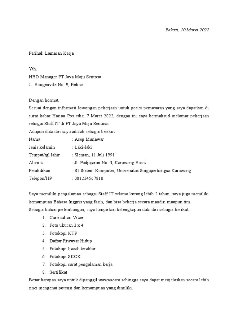 surat kabar Harian Pos edisi 7 Maret 2022, dengan ini saya bermaksud melamar pekerjaan