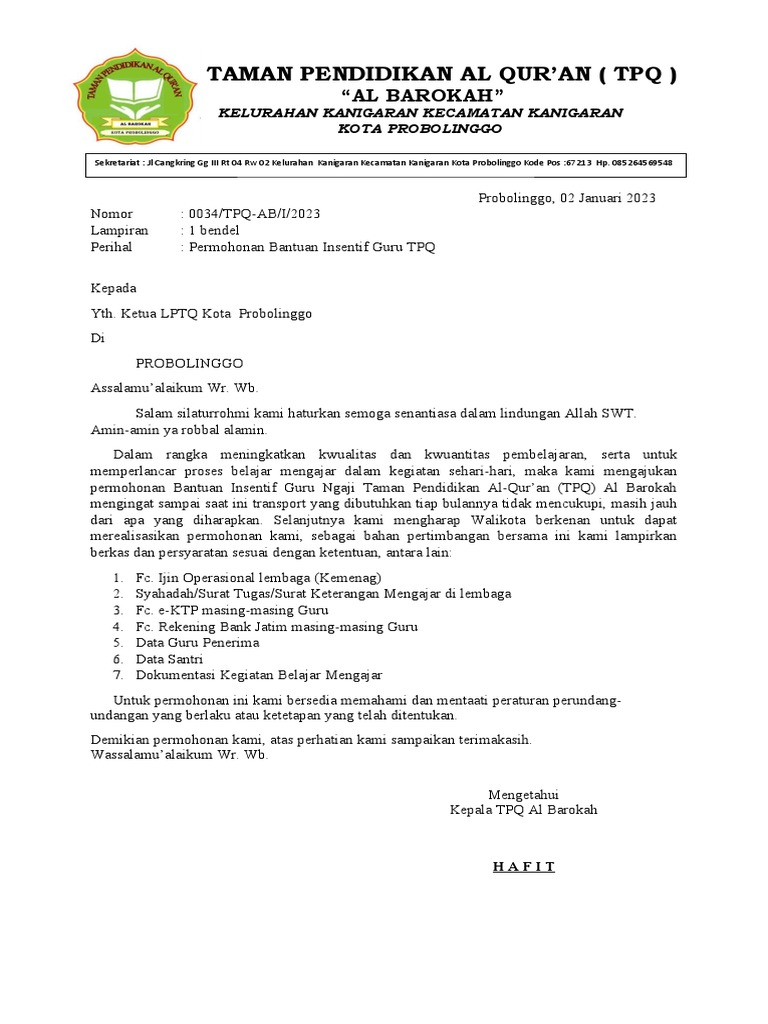 Perihal : Permohonan Bantuan Insentif Guru TPQ