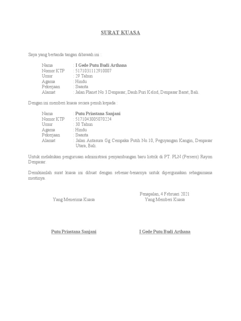 Demikianlah surat kuasa ini dibuat dengan sebenar-benarnya untuk dipergunakan sebagaimana