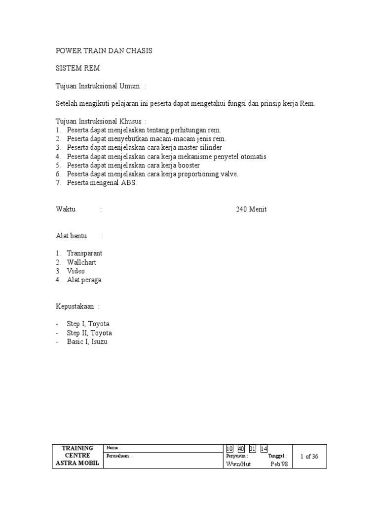 Setelah mengikuti pelajaran ini peserta dapat mengetahui fungsi dan prinsip kerja Rem.