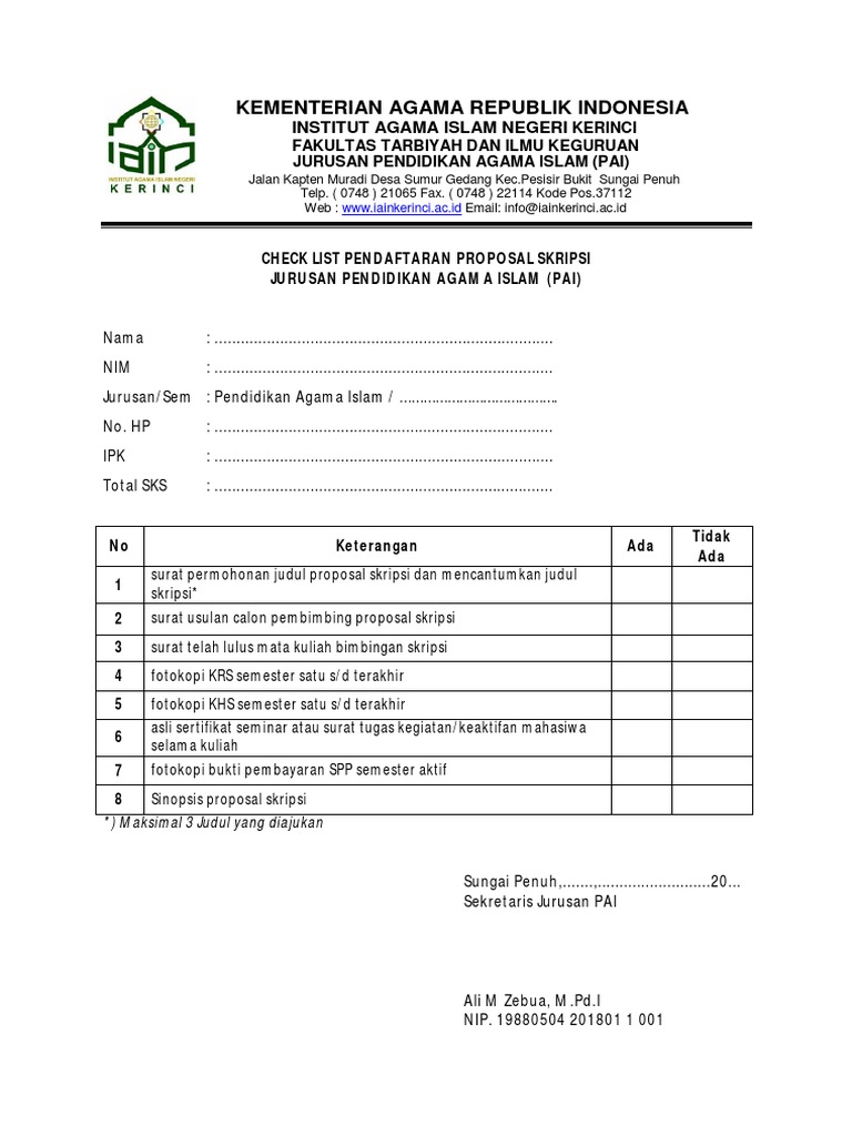Checklist Pendaftaran Skripsi PAI IAIN Kerinci