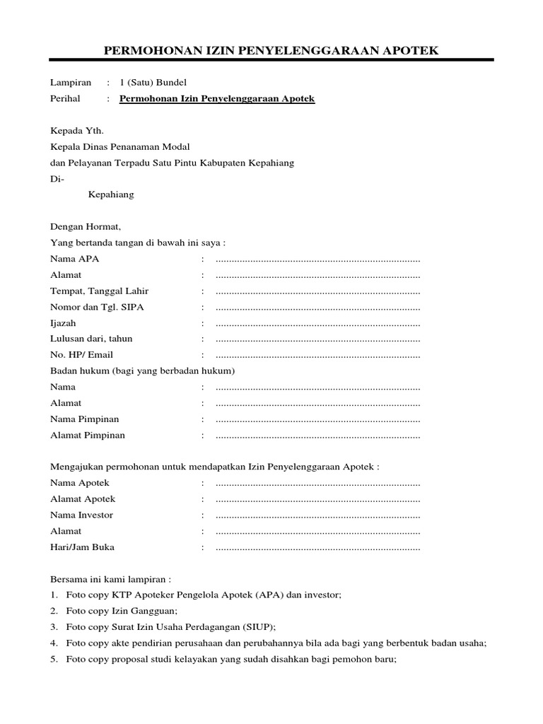 Perihal : Permohonan Izin Penyelenggaraan Apotek
