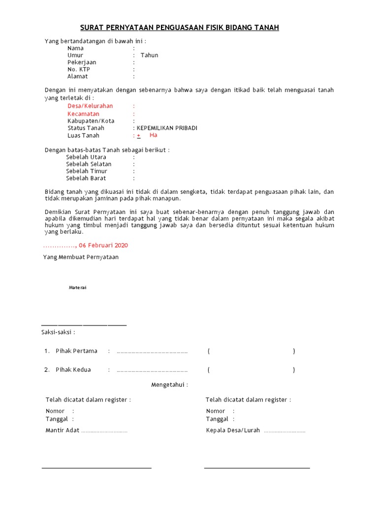 SURAT PERNYATAAN PENGUASAAN FISIK BIDANG TANAH