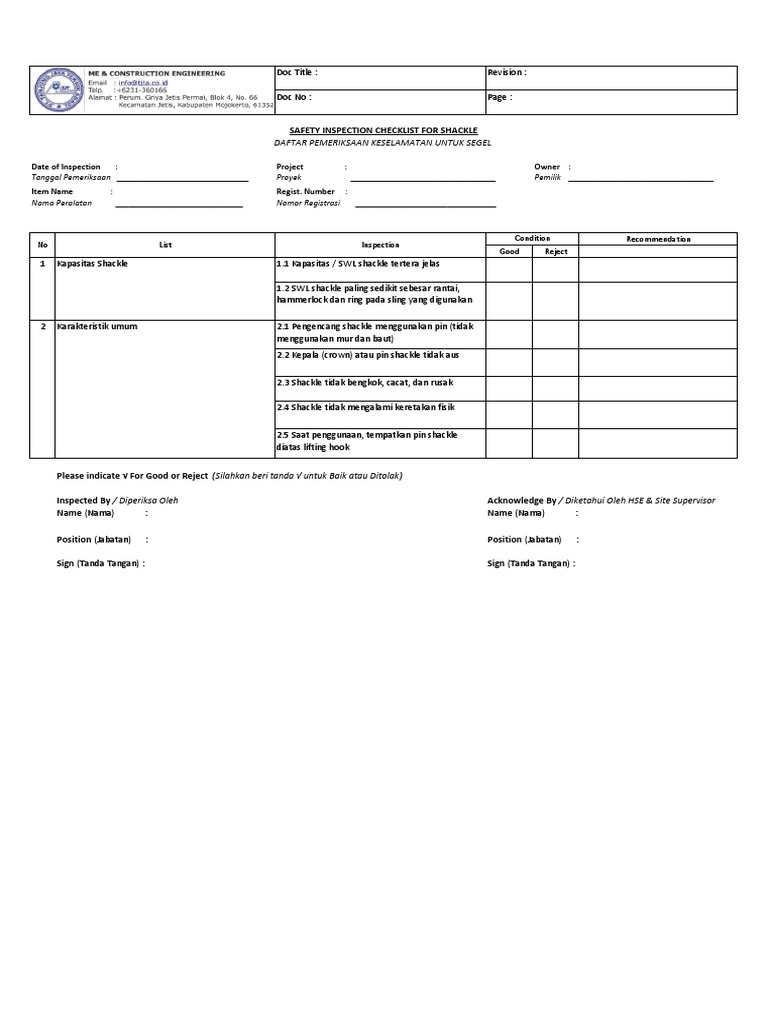 SAFETY INSPECTION CHECKLIST FOR SHACKLE
