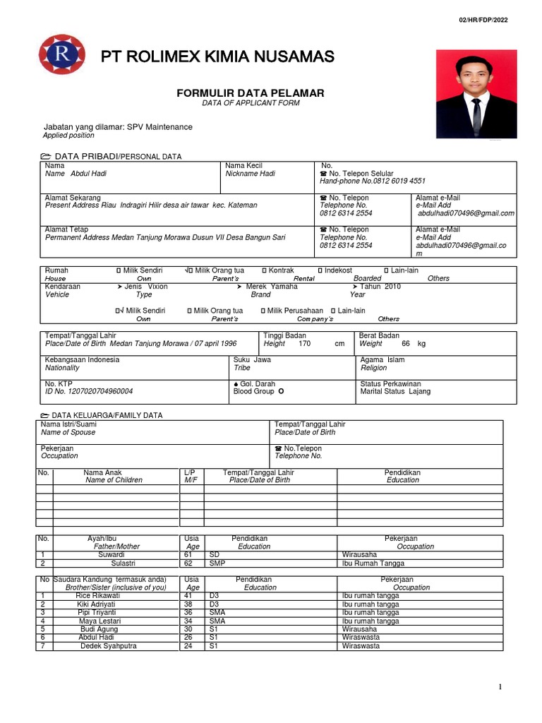 Name Abdul Hadi Nickname Hadi No. Telepon Selular