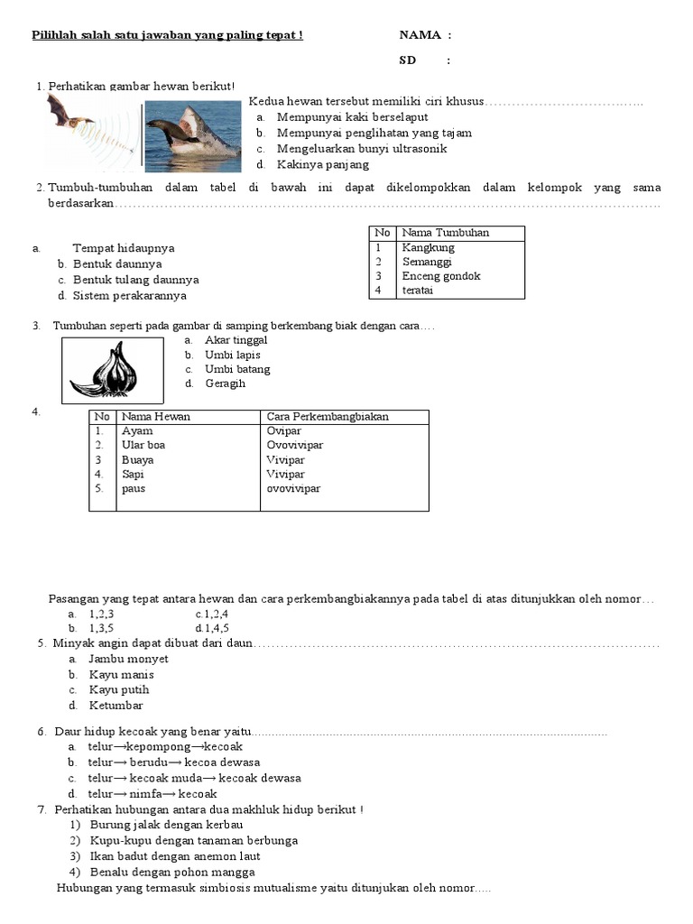 Pasangan yang tepat antara hewan dan cara perkembangbiakannya pada tabel di atas ditunjukkan oleh nomor…