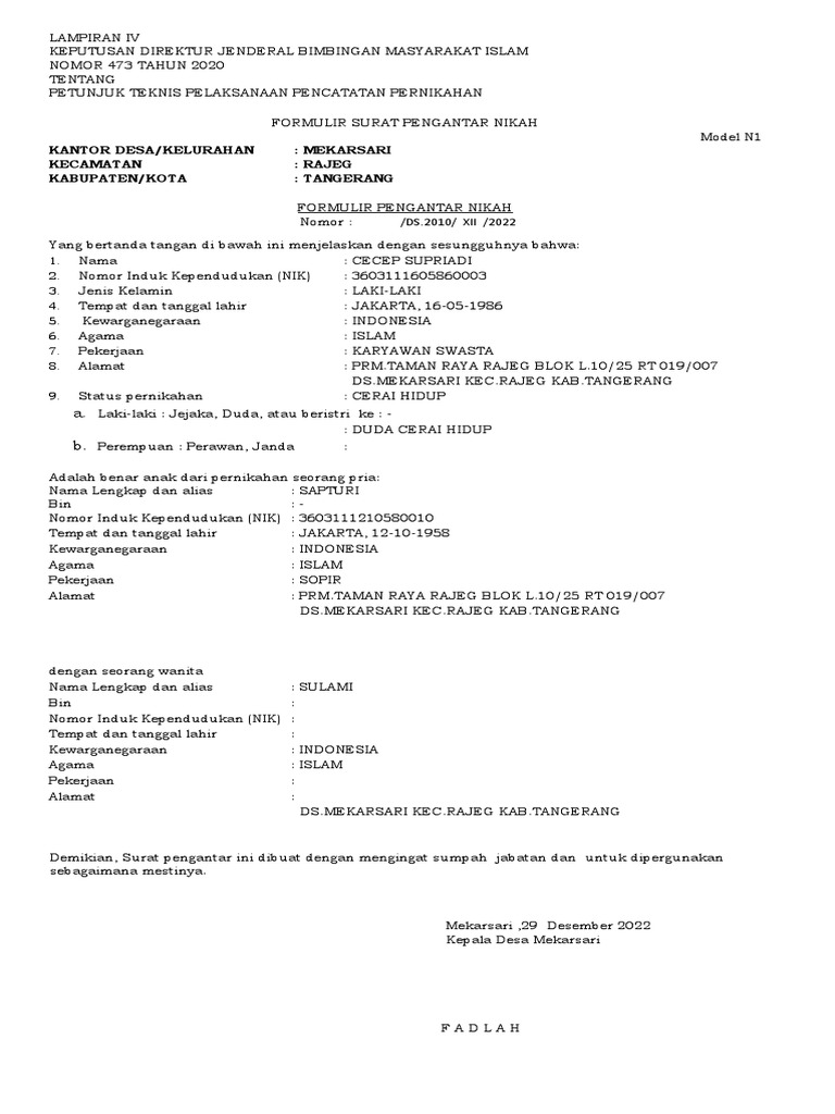 Perihal : Permohonan kehendak nikah Mekarsari , 29 Desember 2022