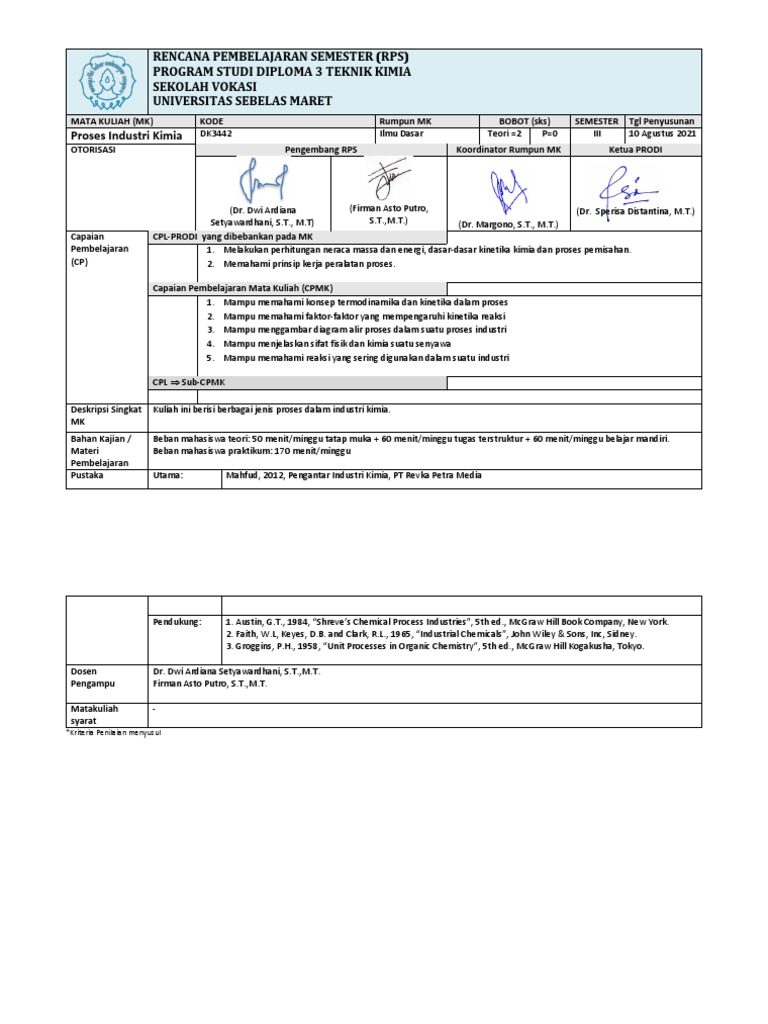 Proses Industri Kimia DK3442 Ilmu Dasar Teori =2 P=0 III 10 Agustus 2021