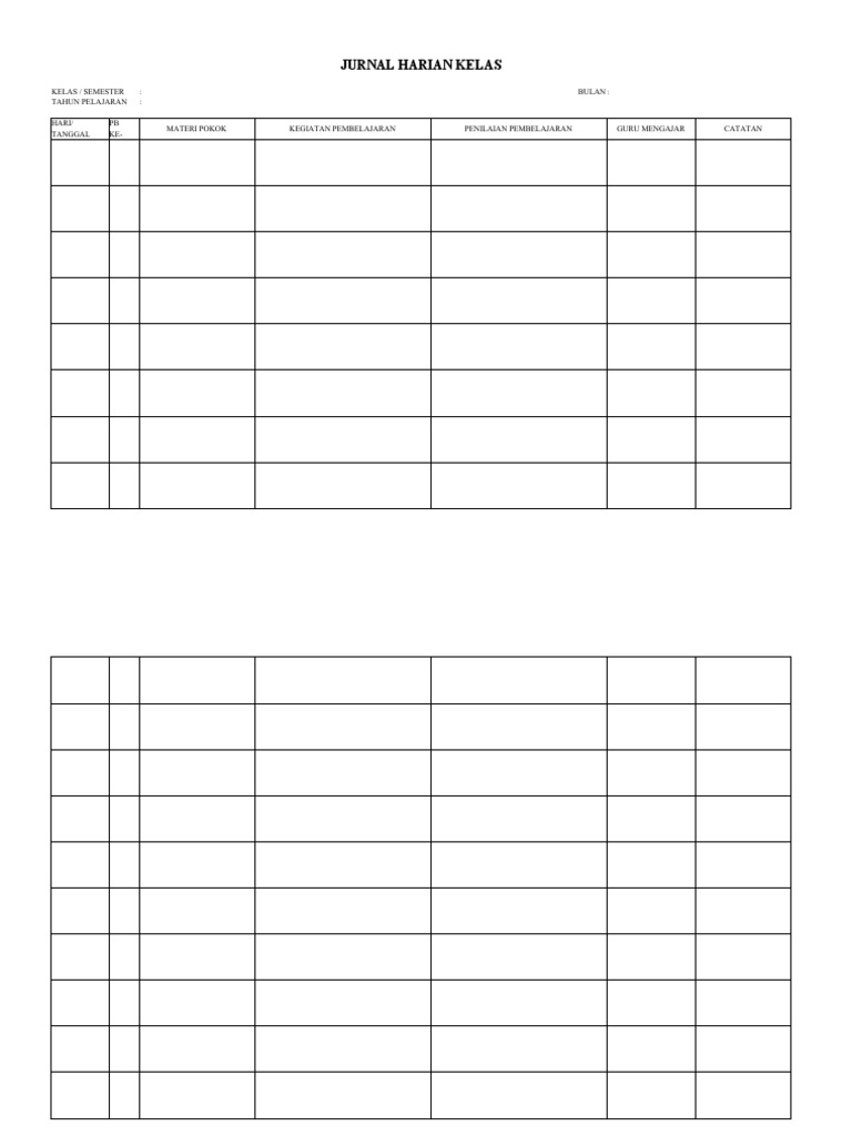 Jurnal harian kelas mencatat kegiatan pembelajaran dan penilaian di kelas untuk bulan tertentu, termasuk materi pokok, kegiatan, penilaian, dan guru pengajar yang mencatatnya.