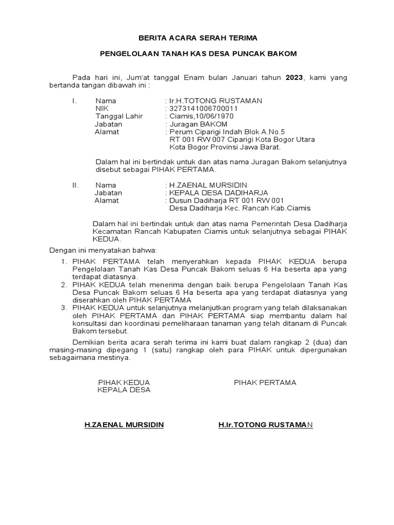2. PIHAK KEDUA telah menerima dengan baik berupa Pengelolaan Tanah Kas