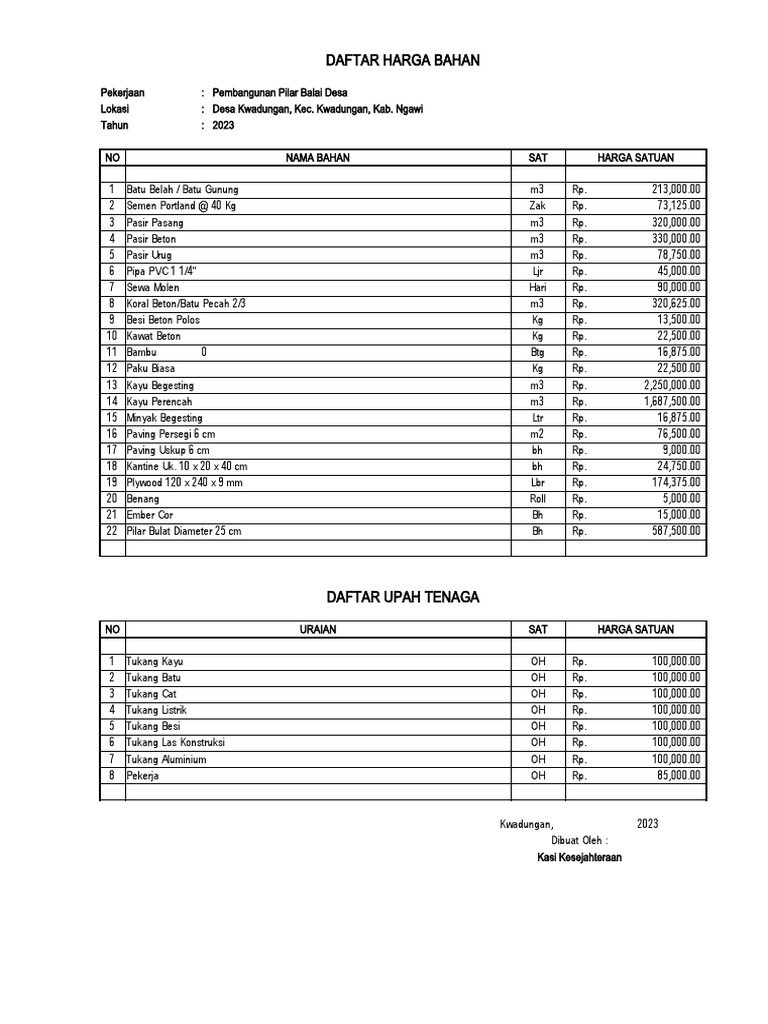 DAFTAR HARGA BAHAN