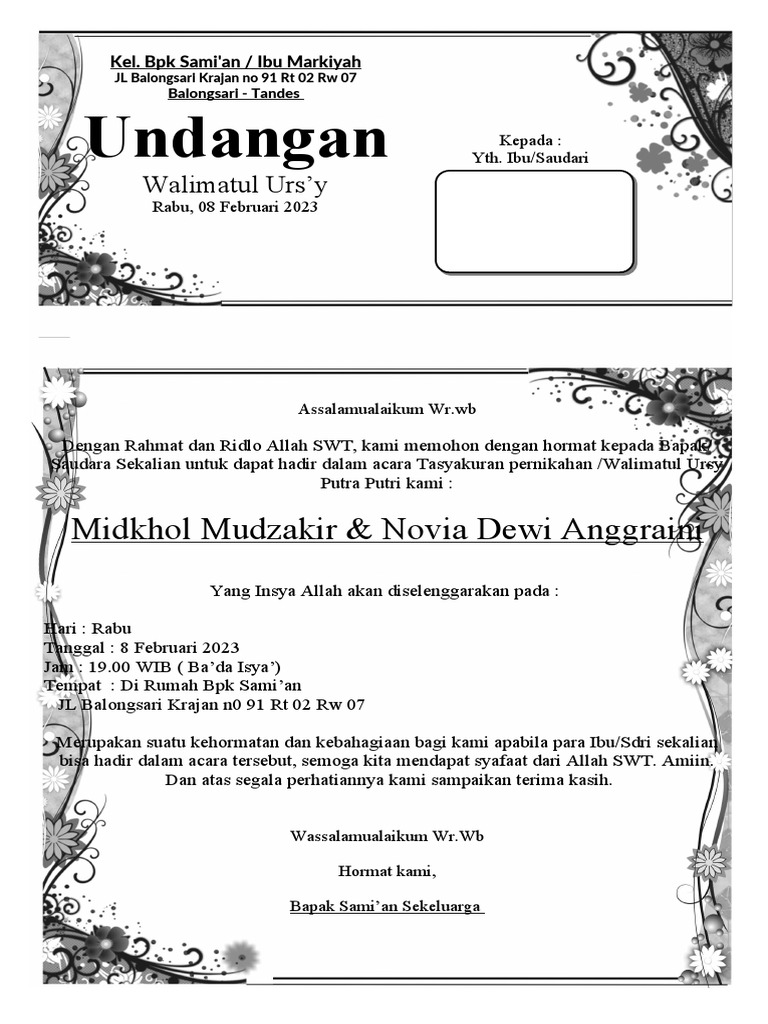 Saudara Sekalian untuk dapat hadir dalam acara Tasyakuran pernikahan /Walimatul Ursy