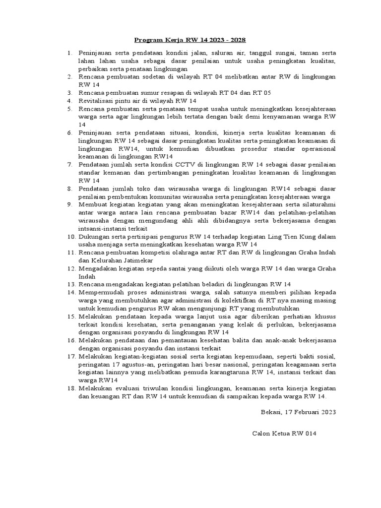 13. Rencana mengadakan kegiatan pelatihan beladiri di lingkungan RW 14