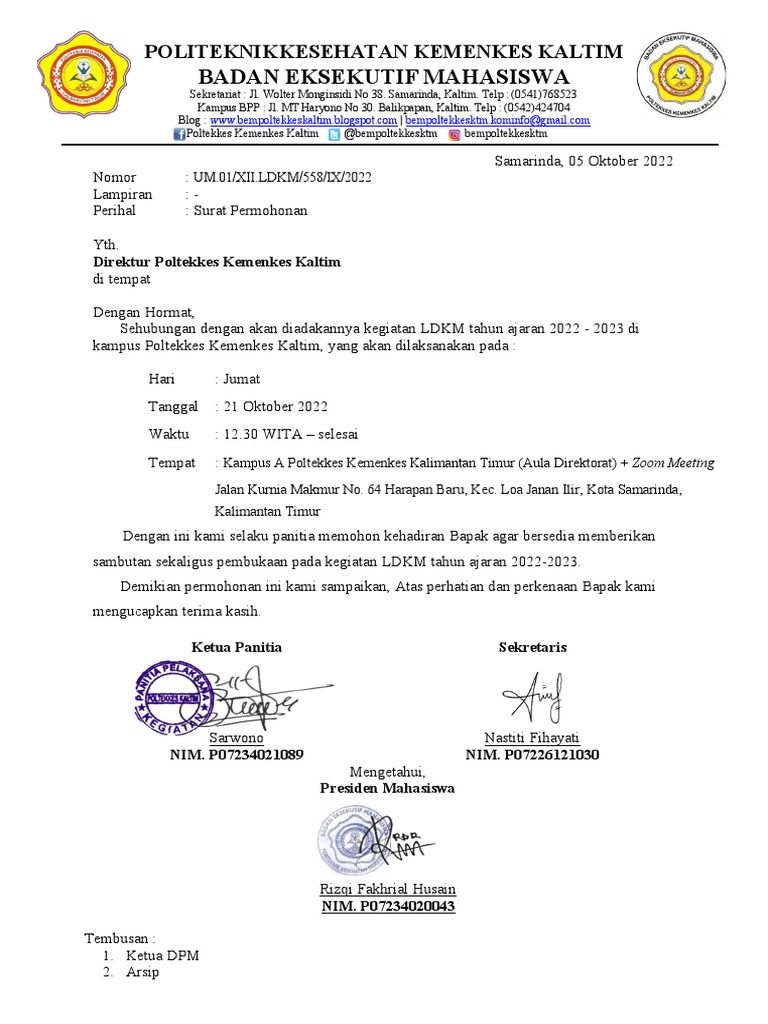 Tempat : Kampus A Poltekkes Kemenkes Kalimantan Timur (Aula Direktorat) + Zoom Meeting