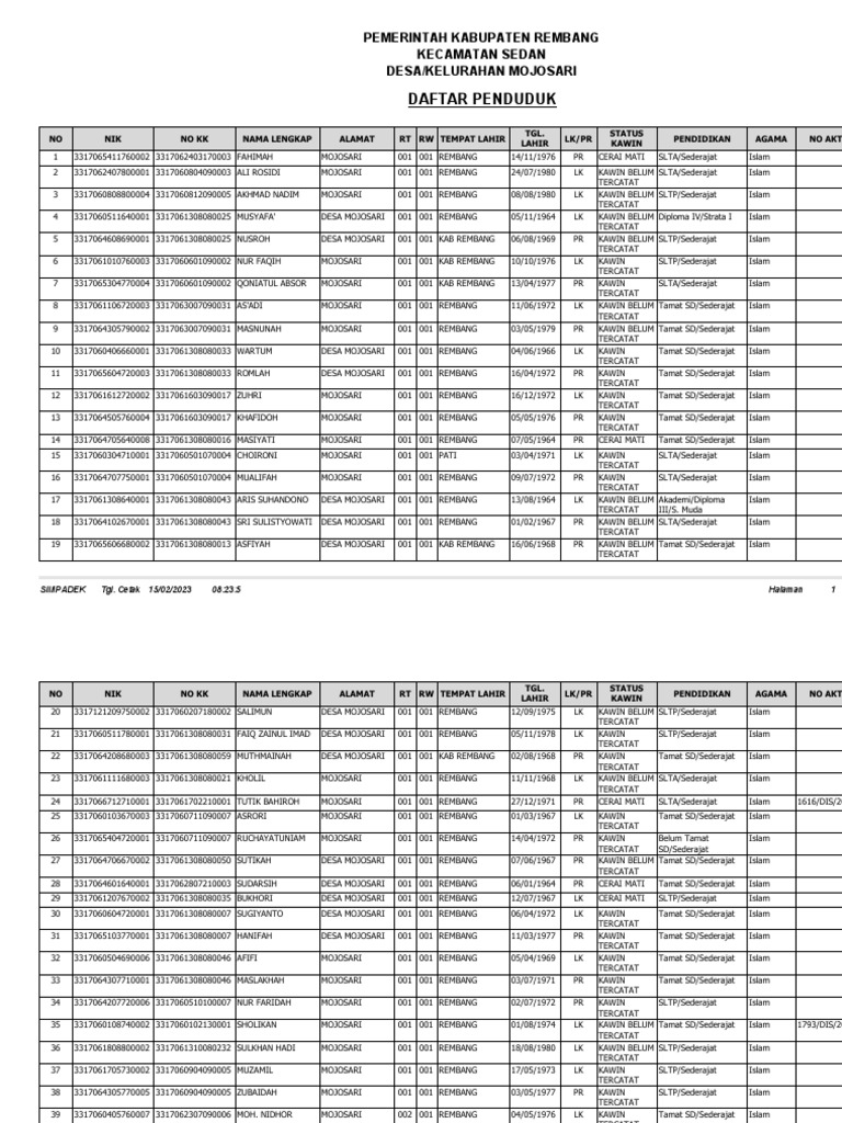 36 3317061808800002 3317061310080232 SULKHAN HADI MOJOSARI 001 001 REMBANG 18/08/1980 LK KAWIN BELUM SLTP/Sederajat Islam