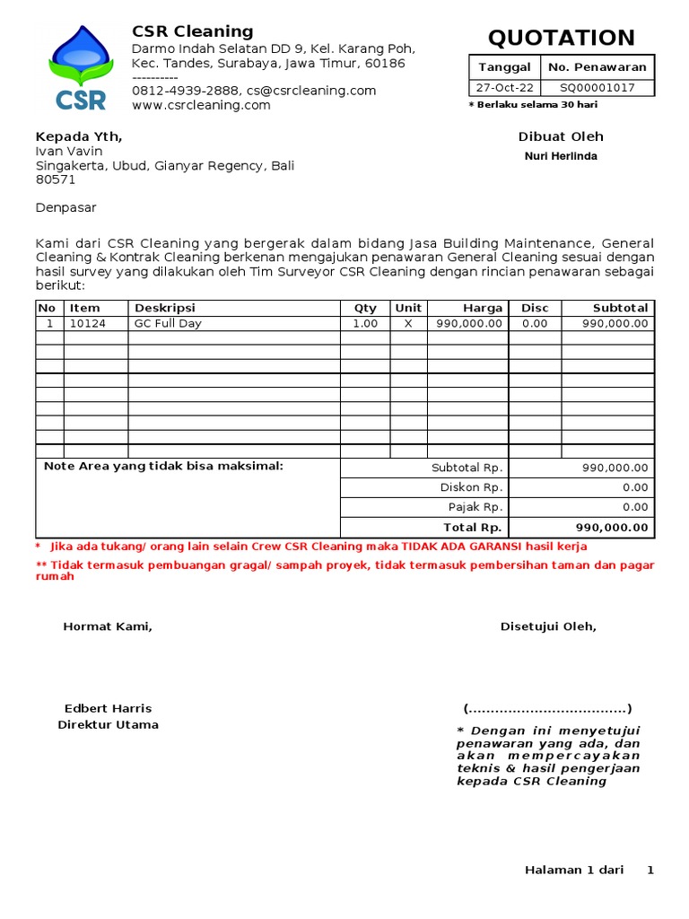 hasil survey yang dilakukan oleh Tim Surveyor CSR Cleaning dengan rincian penawaran sebagai