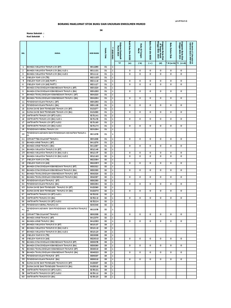 BORANG MAKLUMAT STOK BUKU DAN UNJURAN ENROLMEN MURID