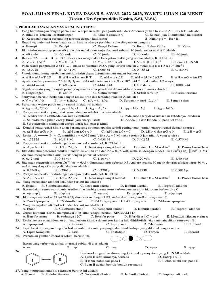 SOAL UJIAN FINAL KIMIA DASAR S.