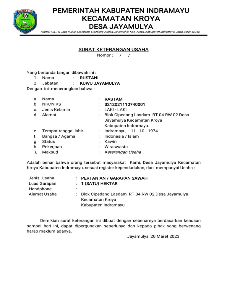Kroya Kabupaten Indramayu, sesuai register kependudukan, dan mempunyai Usaha :