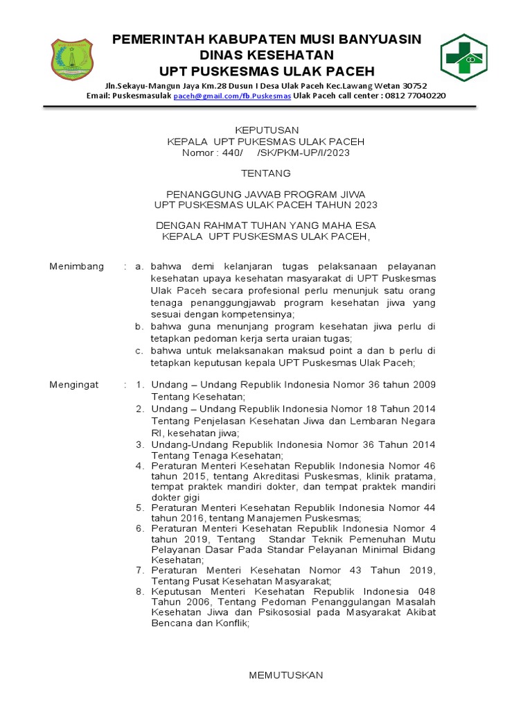 tetapkan keputusan kepala UPT Puskesmas Ulak Paceh;