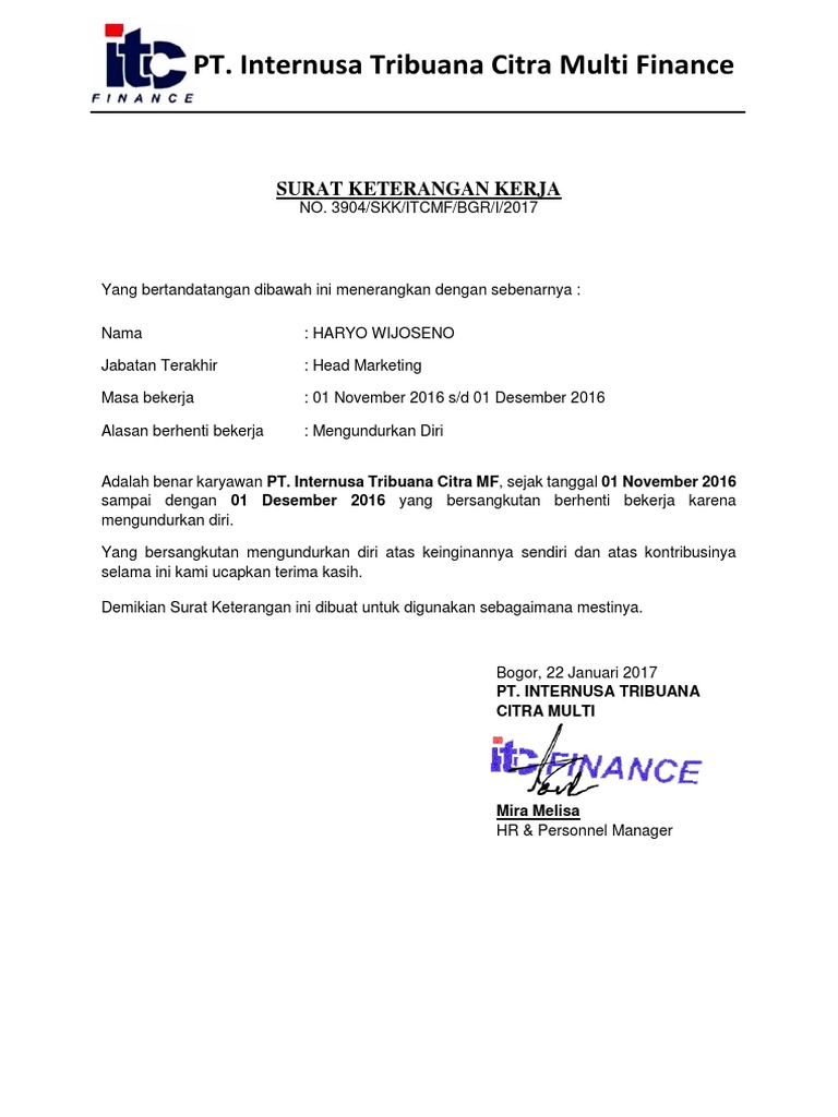 Adalah benar karyawan PT. Internusa Tribuana Citra MF, sejak tanggal 01 November 2016