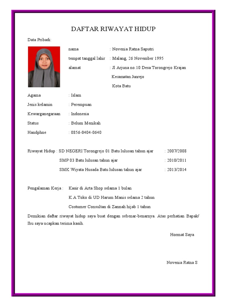 Demikian daftar riwayat hidup saya buat dengan sebenar-benarnya. Atas perhatian Bapak/