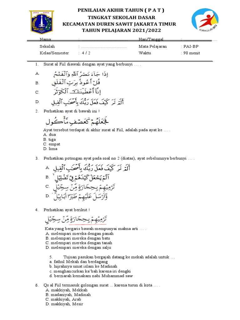 Kelas/Semester : 4/2 Waktu : 90 menit