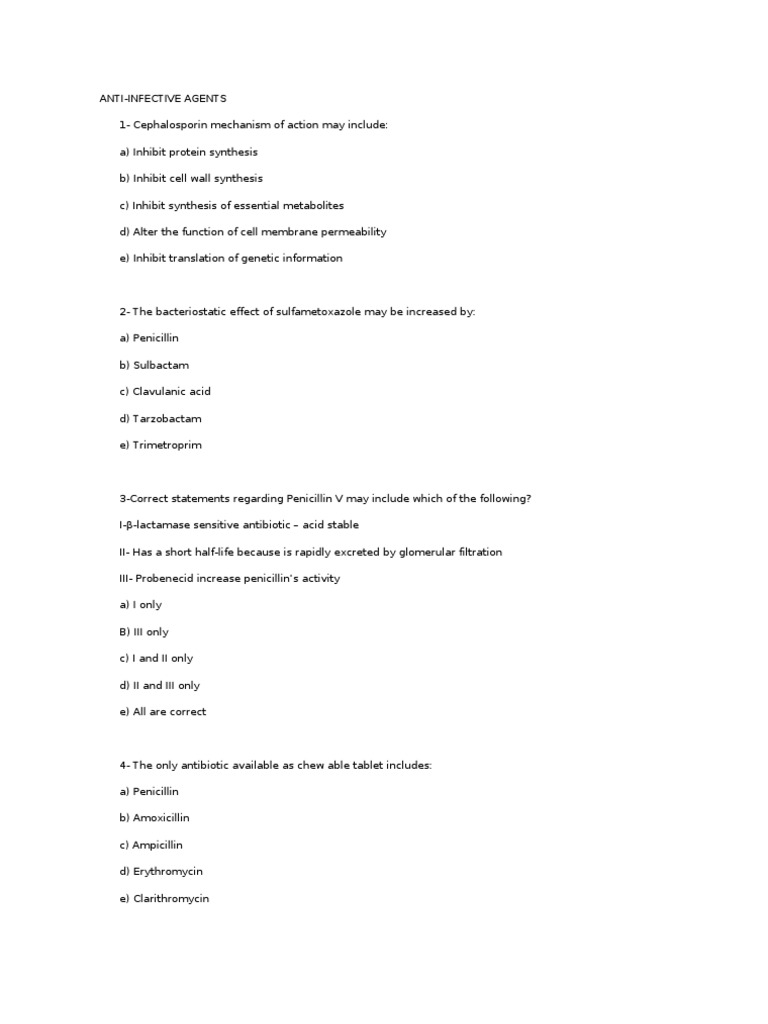 41.Which of the following is one of the most common side effects of vancomycin? a) Ototoxicity b) Disulfiram like side effect c) Diarrhea d) Weight gain e) Hallucinations 45.Bactericidal antimicrobial II. EXCEPT: .Correct statement regarding the mechanism of action of Vancomycin may include: a) Inhibit release of tRNA bound to peptyl site after peptide bond formation b) Inhibit peptide bound formation between acylaminoacids bound to the peptyl and acceptor site c) Inhibit stage II of cell wall synthesis preventing polymerization of the linear peptideoglycan d) Inhibit DNA gyrase in the bacteria e) Bind to ergosterol from pores resulting in linkage of cellular *******s 44.Derivated from natural source: Cephalosporium acremonium III.Example of fourth generation cephalosporin includes: a) Ceftriaxone b) Cefipime c) Cefixime d) Cefotaxime e) Cefoxitin 43.Broad-spectrum agent a) I only b) III only c) I and II only d) II and III only e) All are correct 42.Correct statements regarding CEPHALOSPORINS include: I.All of the following are narrow spectrum protein synthesis inhibitors.