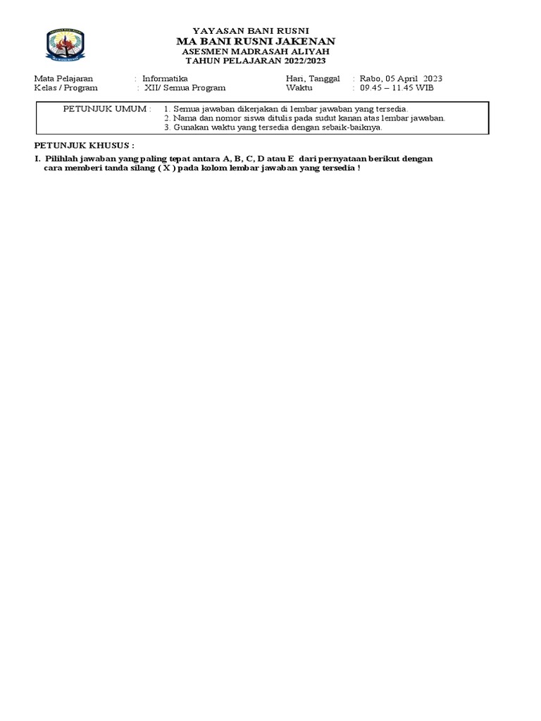 I. Pilihlah jawaban yang paling tepat antara A, B, C, D atau E dari pernyataan berikut dengan
