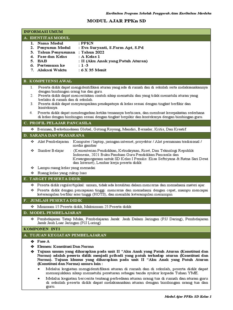 Modul Ajar PPKn SD Kelas 1: Aturan dan Norma
